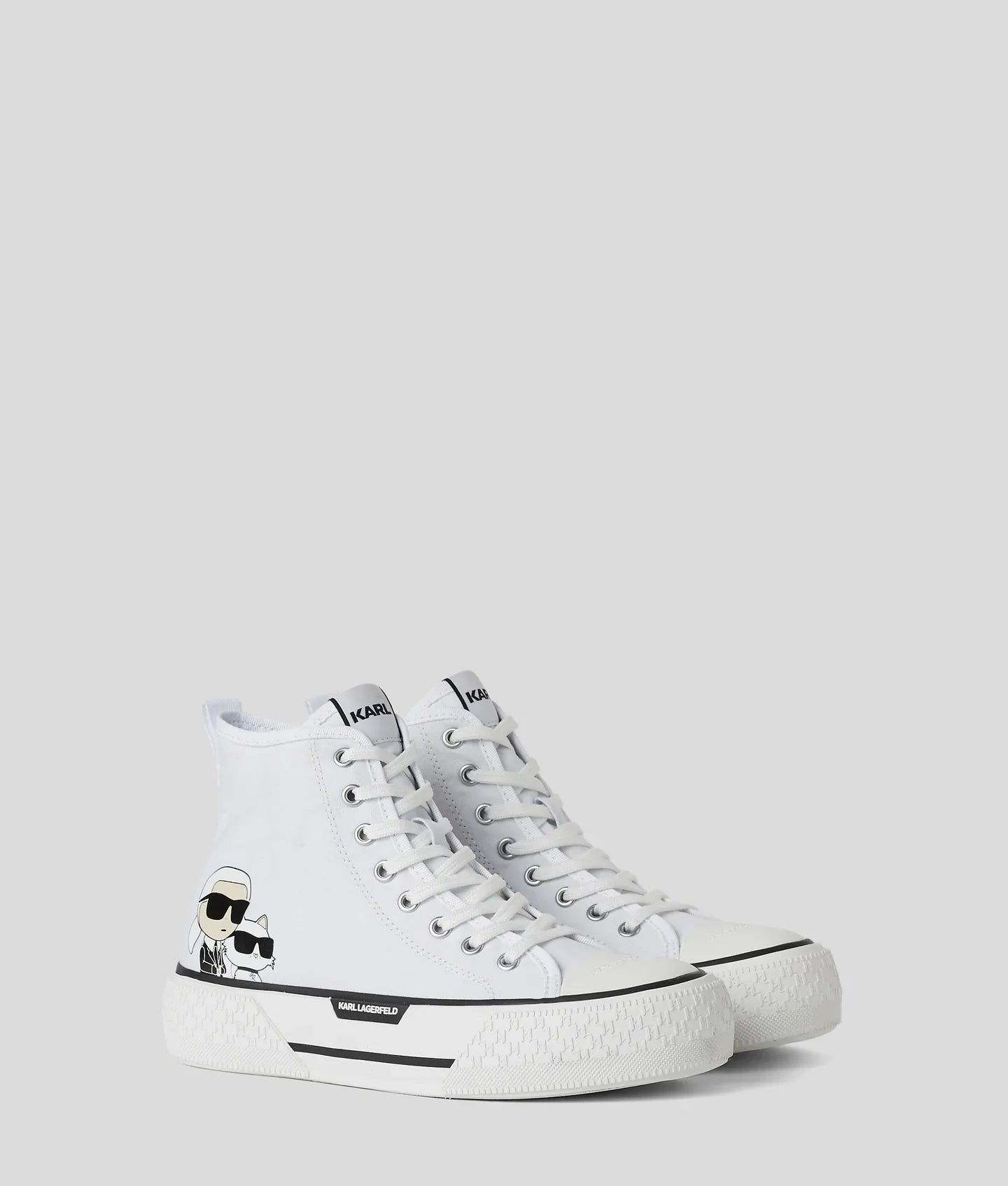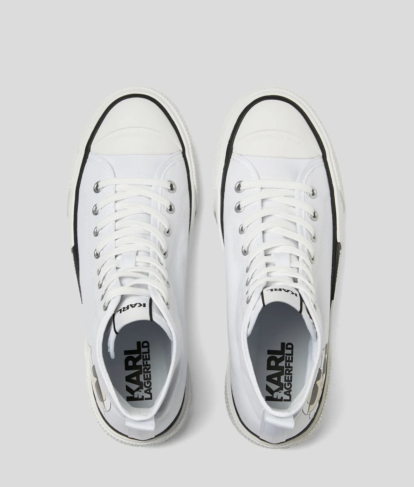 KARL LAGERFELD's high-top sneakers boast an Italian canvas upper for street-style luxury. The lace-up design ensures a perfect fit, while contrasting piping adds a sporty edge. The midsole features a standout logo tab, and the unique NFT IKON Karl and Choupette artwork sets these shoes apart.