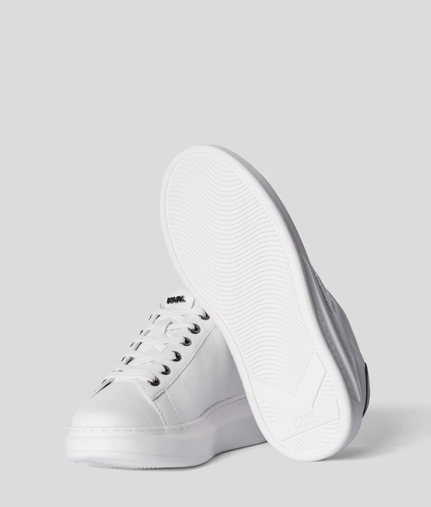 The metallic sheen on the iconic Maison KARL logo is reflected on the heel counter, framing a minimalist Nappa leather sneaker.