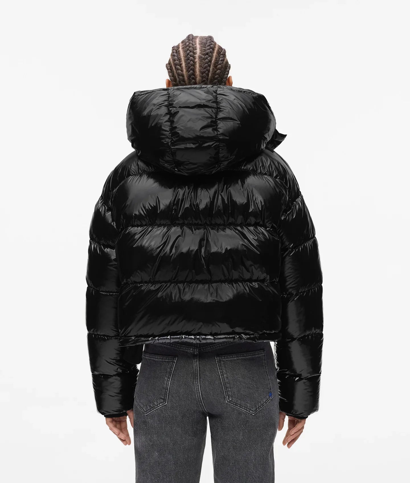 Fusing a classic quilted silhouette with a high-gloss finish, this puffer jacket is an outerwear highlight. A cozy hood and rib-knit cuffs with thumbhole cutouts make it ready for cold days.
